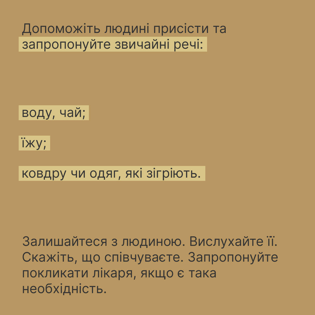 Людина, яка переживає обстріл рідної домівки, зазнає сильного стресу, і не завжди помічає, як опиняється на вулиці босоніж чи без речей першої необхідності. Справа рятувальників — відвести постраждалих на безпечну відстань, переконатися, що ніхто не опинився під завалами. А от перші слова підтримки, склянка води чи теплий одяг будуть доречними (а подекуди й рятівними) навіть від незнайомців. Варто лише пам’ятати кілька простих порад, якими ділиться психологиня Тетяна Єрмолаєва. Нагадаємо, за ініціативою першої леді Олени Зеленської розпочалася всеукраїнська програма ментального здоров’я «Ти як?», яка покликана створити систему сервісів і послуг, які зможуть різними способами та дієвими механізмами підтримати українців у складні часи повномасштабної війни. Дізнатися більше інформації можна на сайті Програми, а також на сторінках у соціальних мережах: Facebook, Instagram, YouTube, Twitter, Telegram, TikTok, Viber.